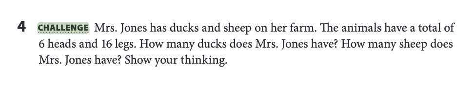 Full disclosure: That ducks and sheep thing really happened…. Except it was me having the revelation, having taught a 2nd grade challenge problem, and after sitting in on an 8th grade algebra class this winter.
